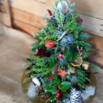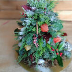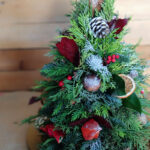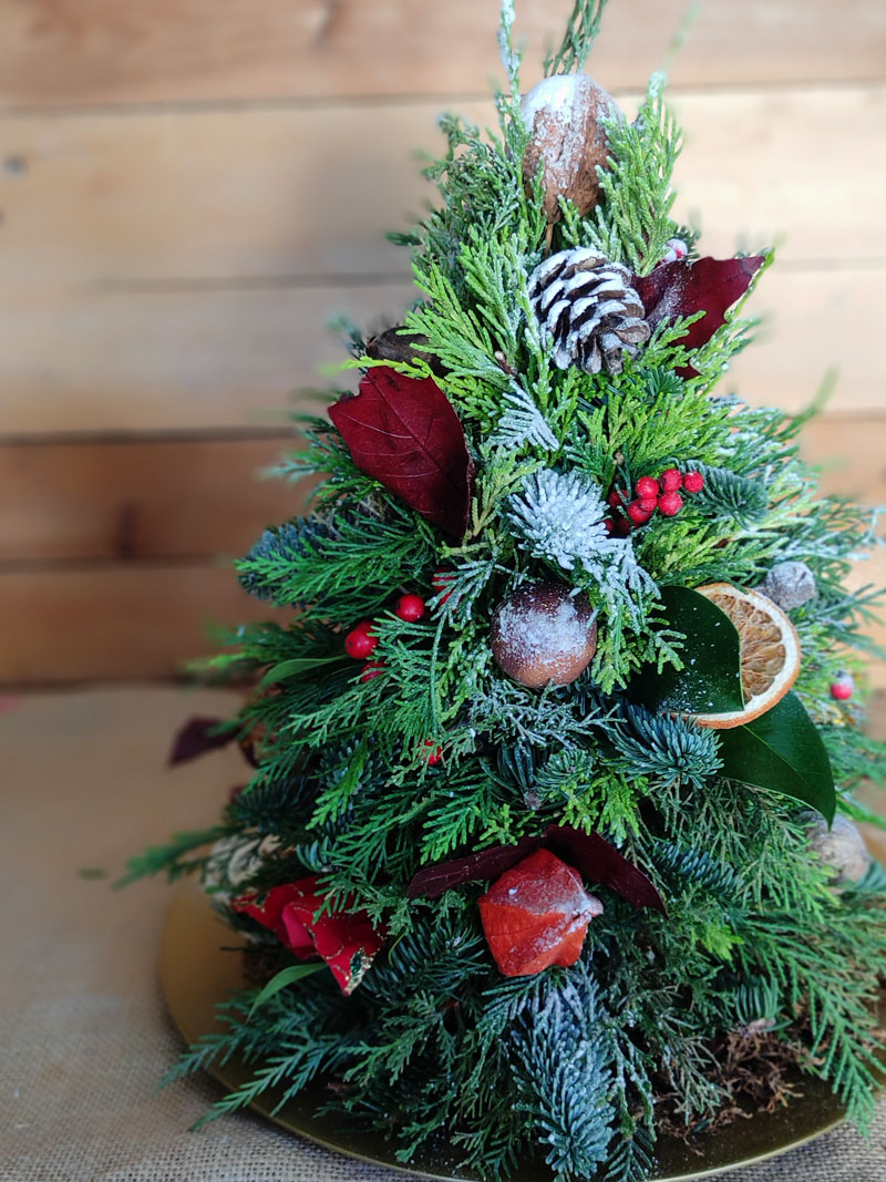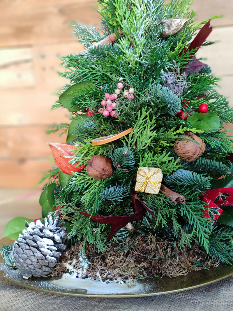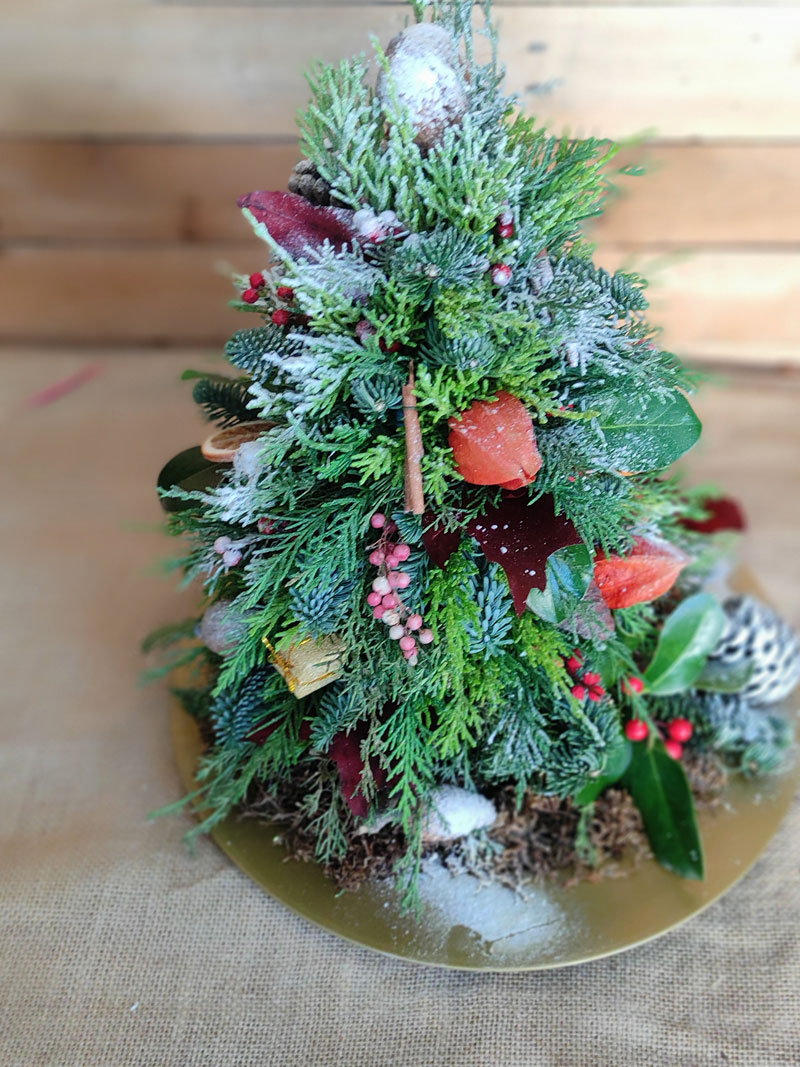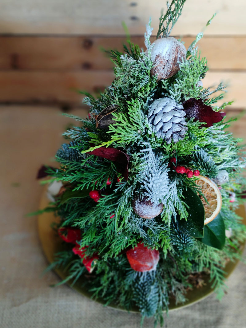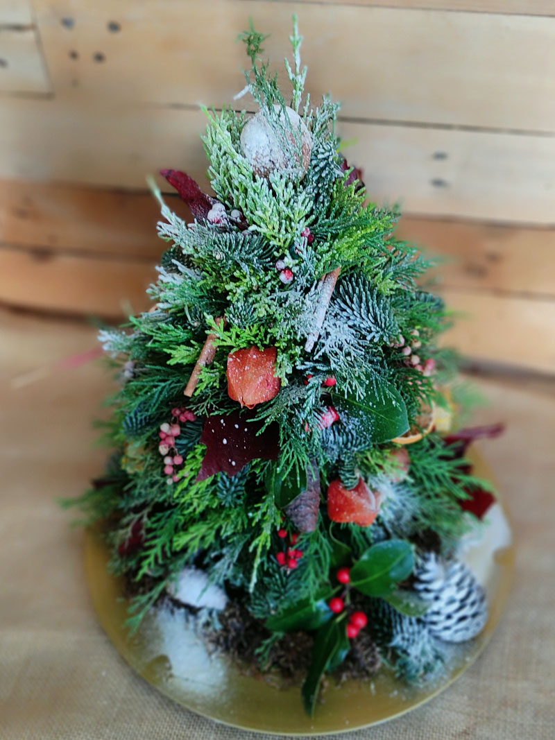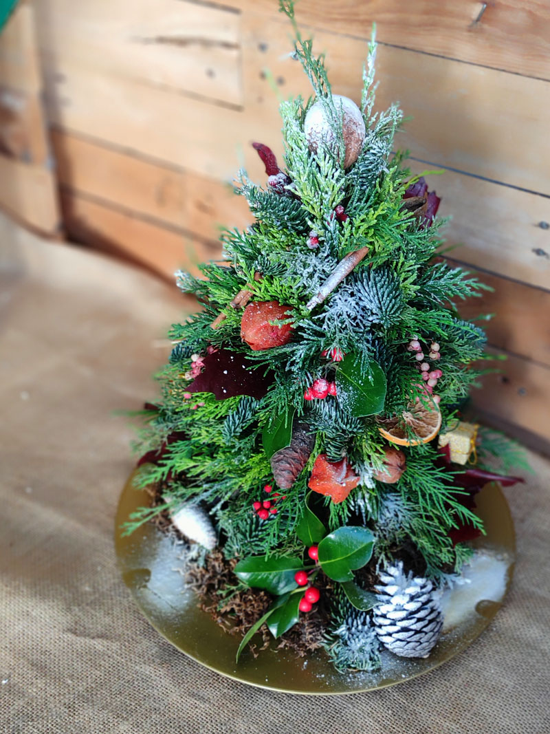 Χριστουγεννιάτικη σύνθεση απομίμηση δεντράκι σε δίσκο. Αποτελείται από έλατο, τούγια και διάφορα διακοσμητικά.