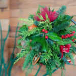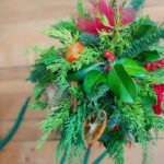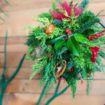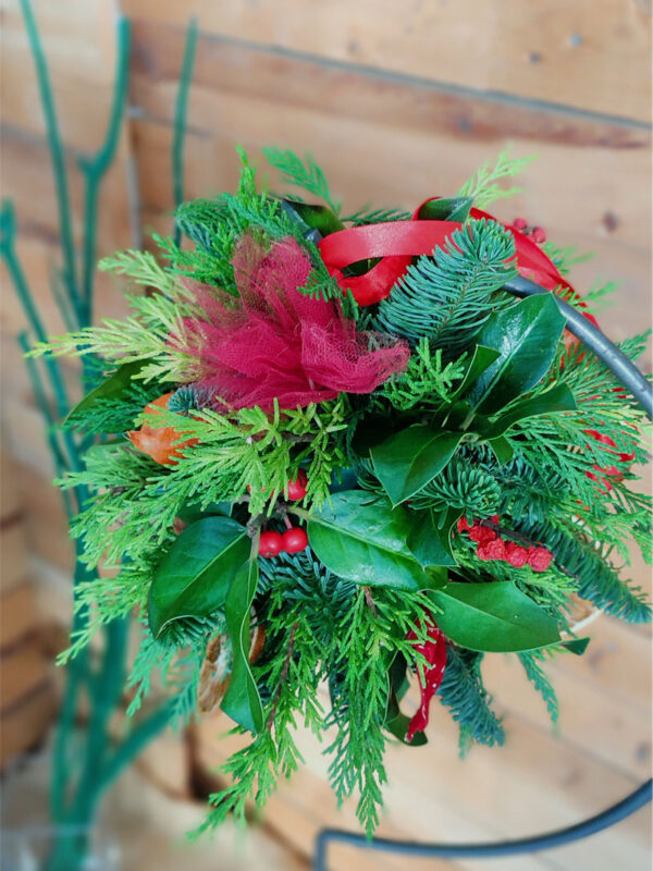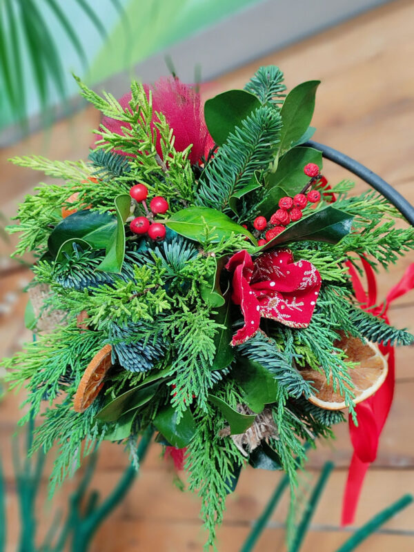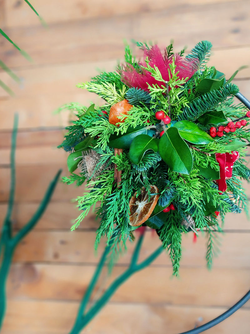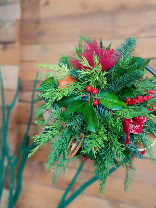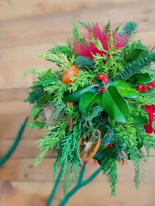 Χριστουγεννιάτικη σύνθεση απομίμηση χριστουγεννιάτικη μπάλα στολίδι. Αποτελείται από τούφια, ου, έλατο και διάφορα φυσικά διακοσμητικά.
