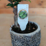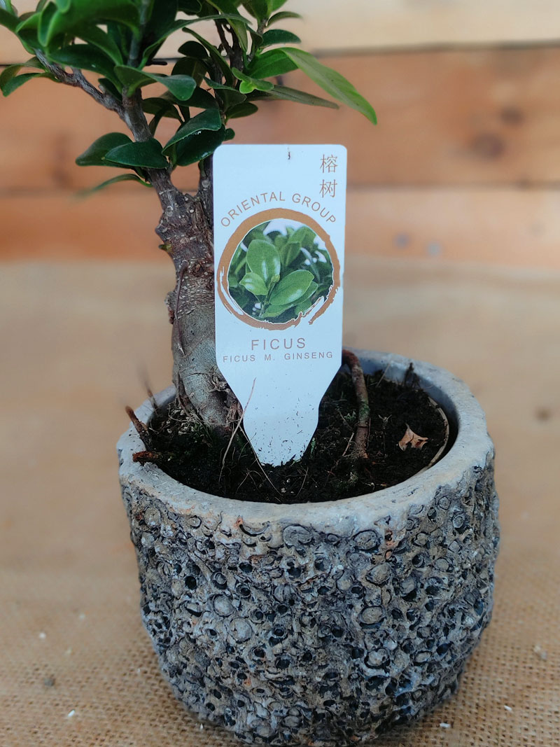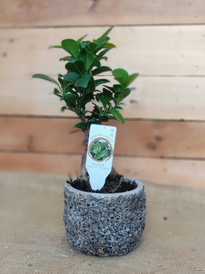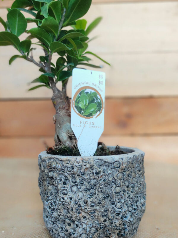 Δέντρο Bonsai ποικιλίας φίκος ginseng ύψους περίπου 18 εκ., τοποθετημένο σε cement ποτ με ιδιαίτερο ανάγλυφο σχέδιο.