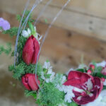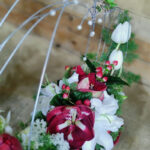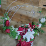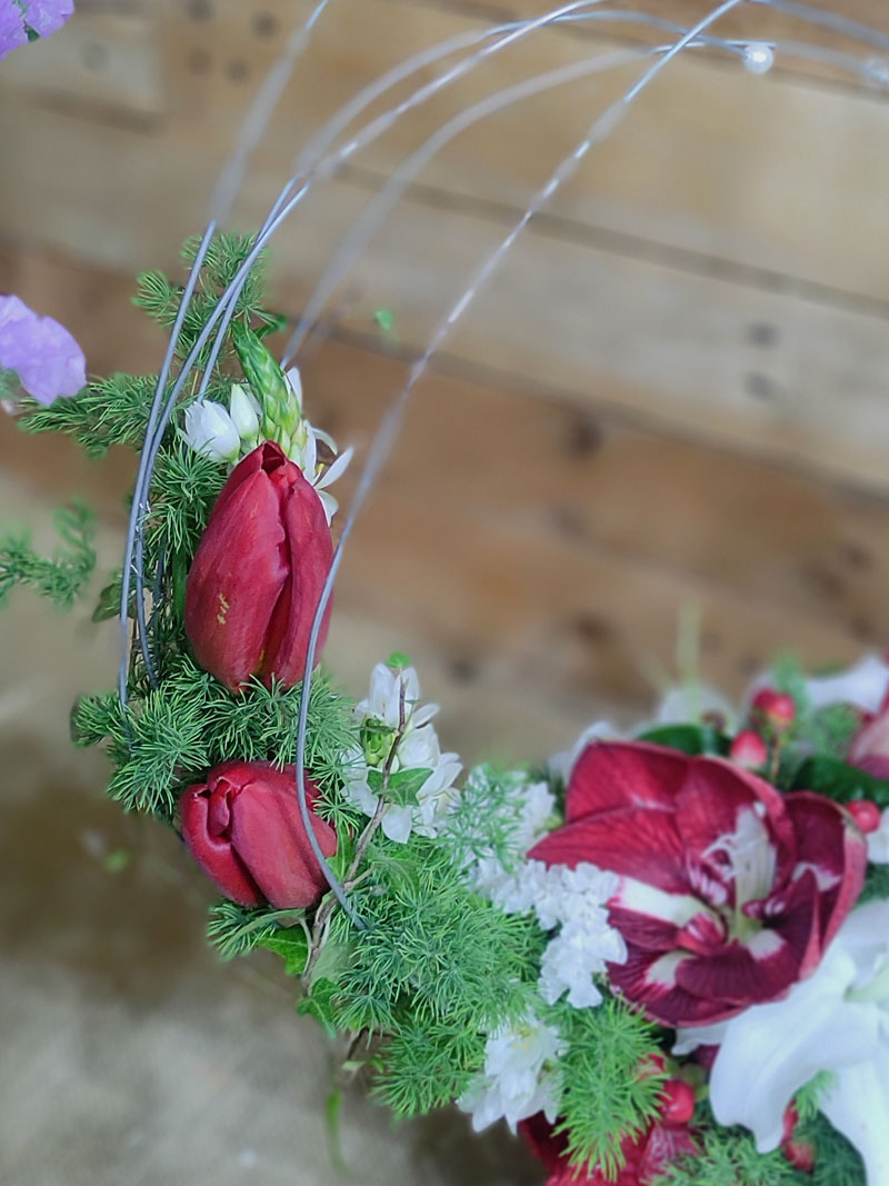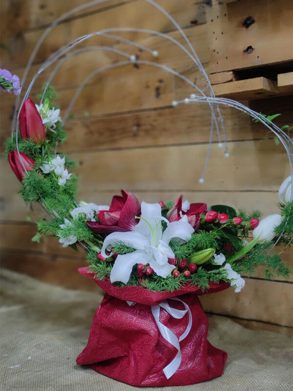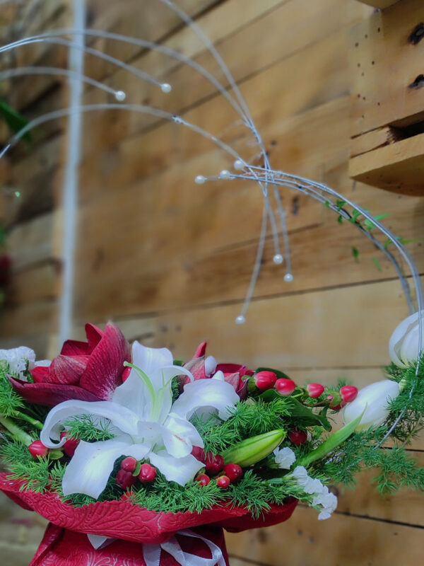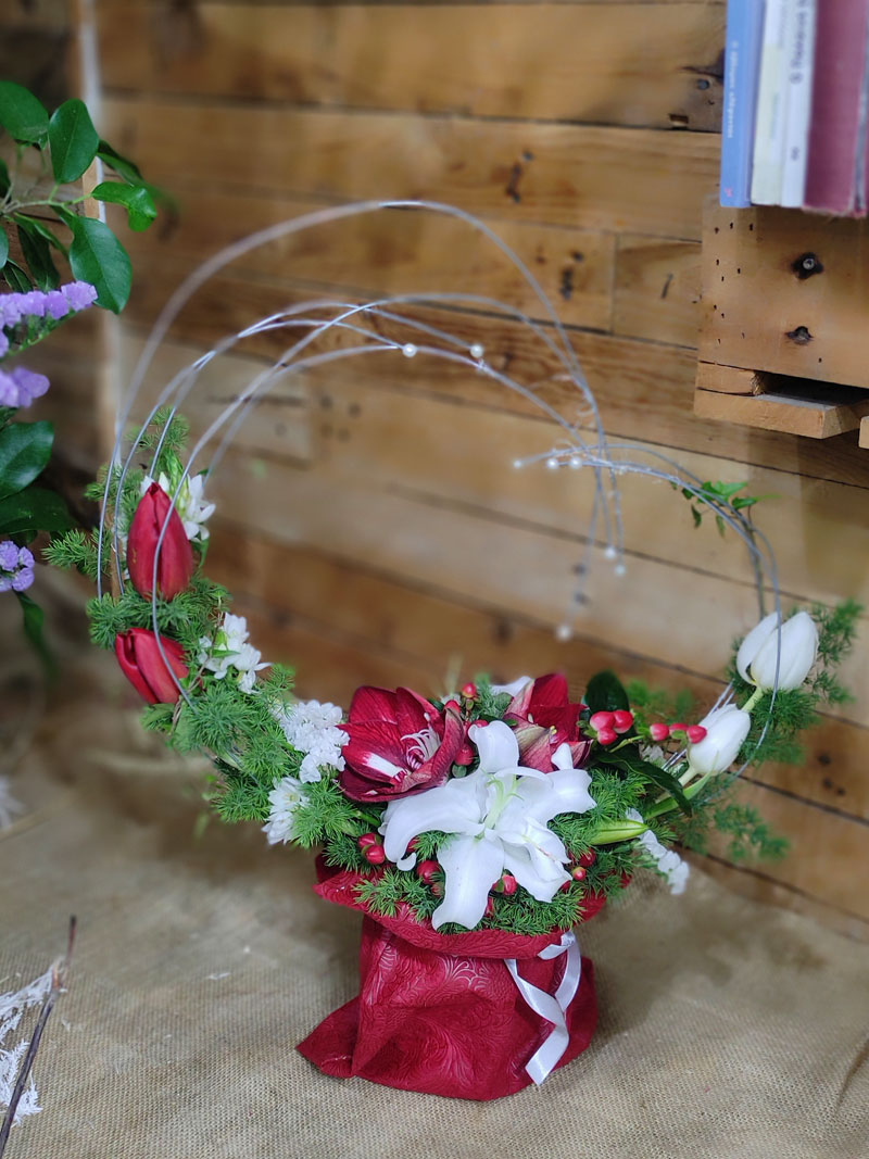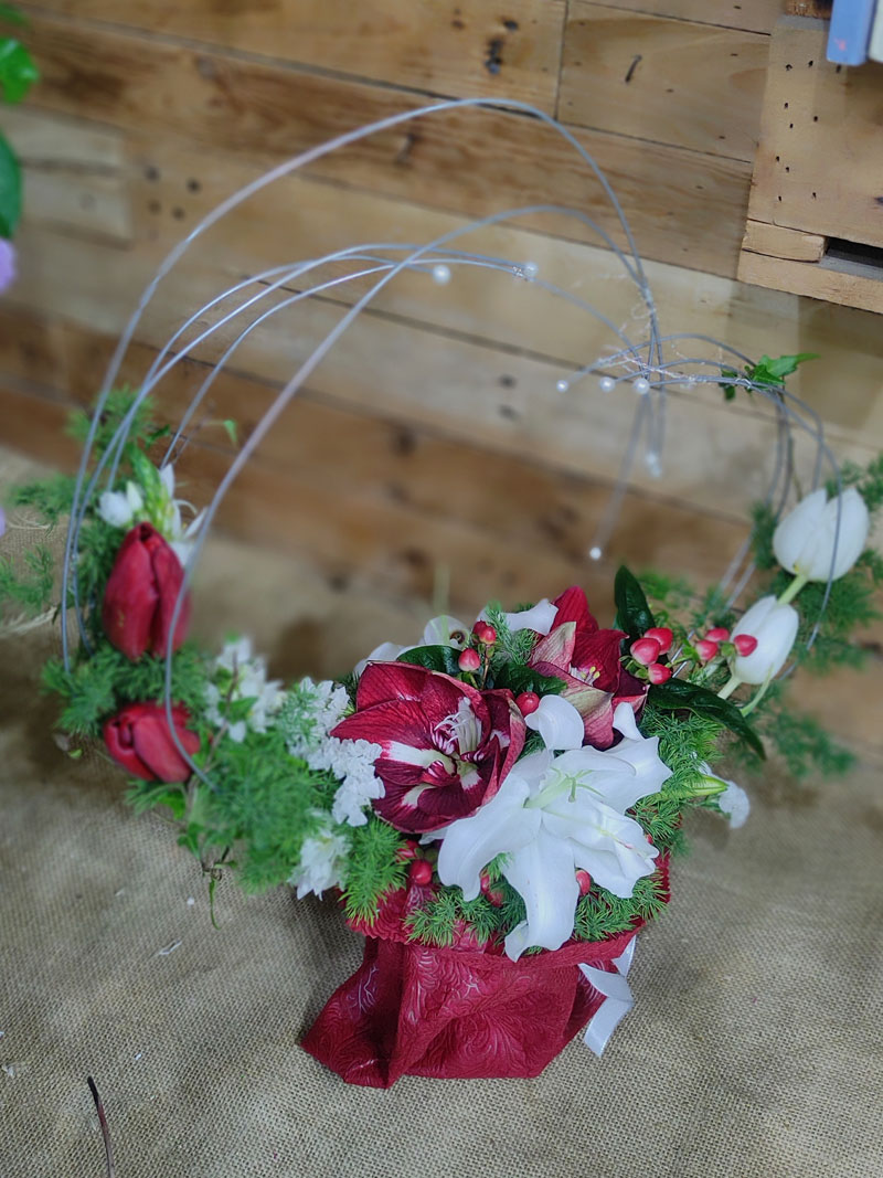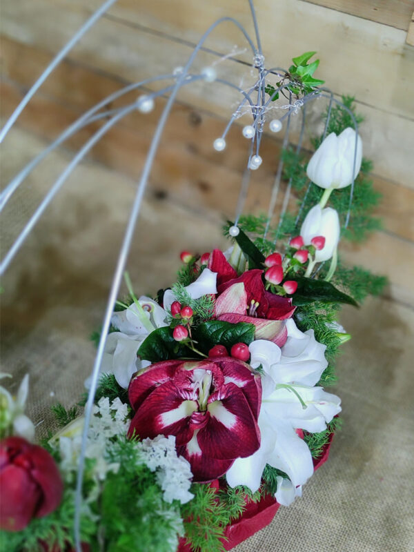 Σύνθεση σε βάση με σχεδιασμό μεταλλικής καρδιάς και λεπτομέρειες από πέρλες. Περιλαμβάνει αμαρυλλίδα, λίλιουμ, τουλίπα, ορνιθογκάλουμ, αμάραντο και asparagus.