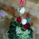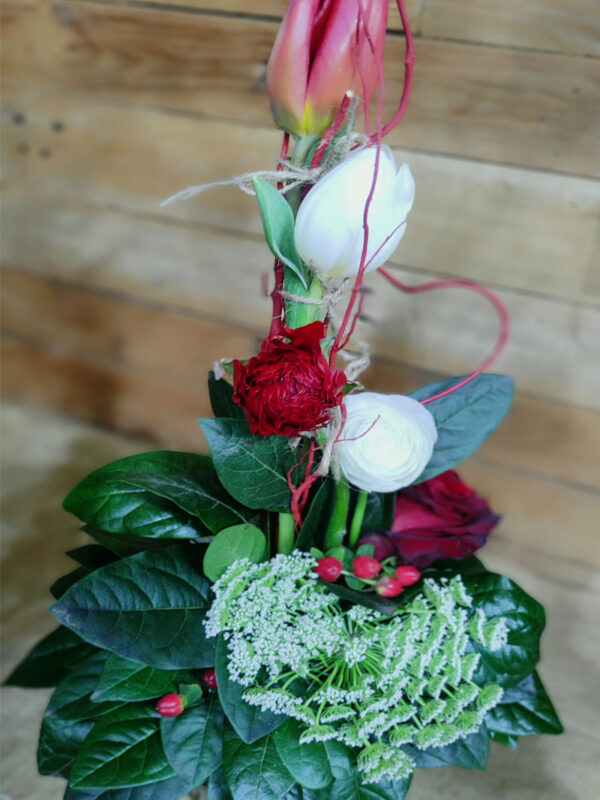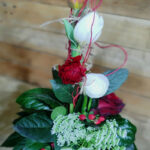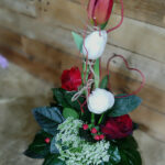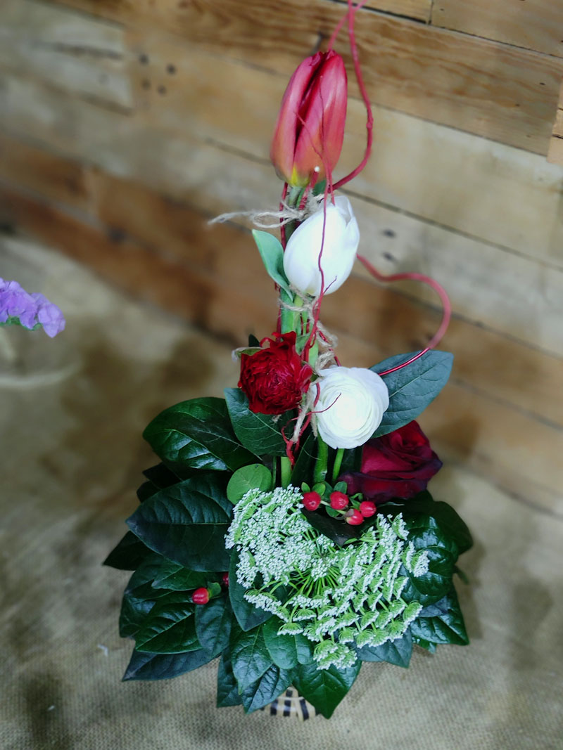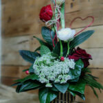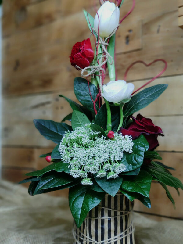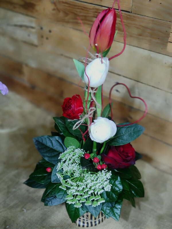 Σύνθεση ψιλόλιγνη σε μεταλλικό δοχείο με διάφορα λουλούδια σε κόκκινες αποχρώσεις. Περιλαμβάνει τριαντάφυλλο, τουλίπα, νεραγκούλα, Άμμι ή αλλιώς δαντέλα της βασίλισσα Άννας και λεπτομέρεια κόκκινη καρδία από μεταλλικό έλασμα.