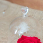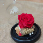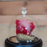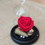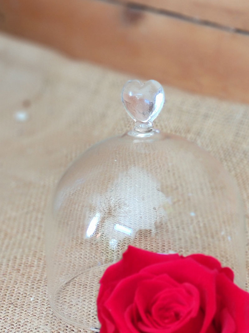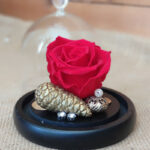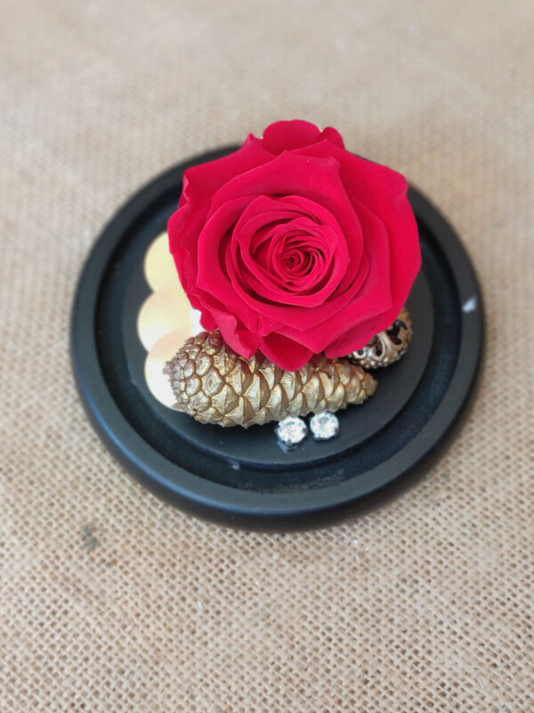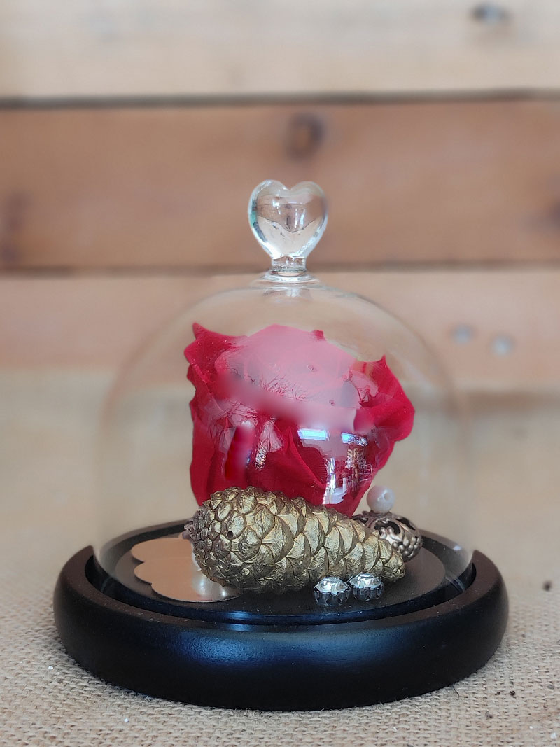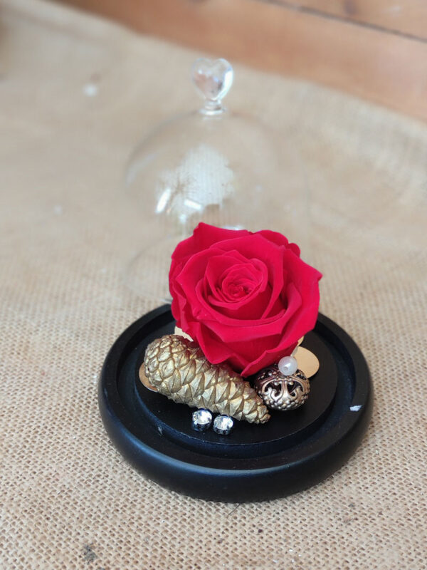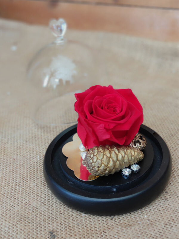 Αιώνιο τριαντάφυλλο κόκκινου χρώματος σε χαμηλό γυάλινο θόλο καμπάνα με μαύρη ξύλινη βάση και καρδιόσχημο χερούλι. Έχει ύψος περίπου ύψος 10 εκ. και διάμετρο περίπου 9 εκ. Συνοδεύεται από χρυσές και απαστράπτουσες λεπτομέρειες, καθώς και κουκουνάρι.