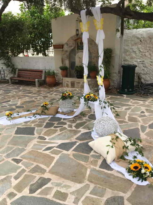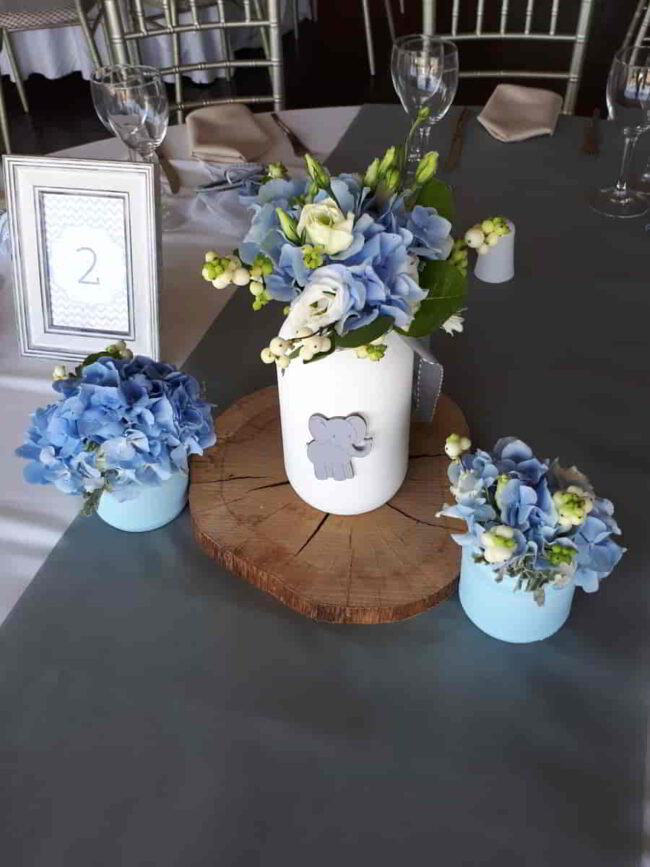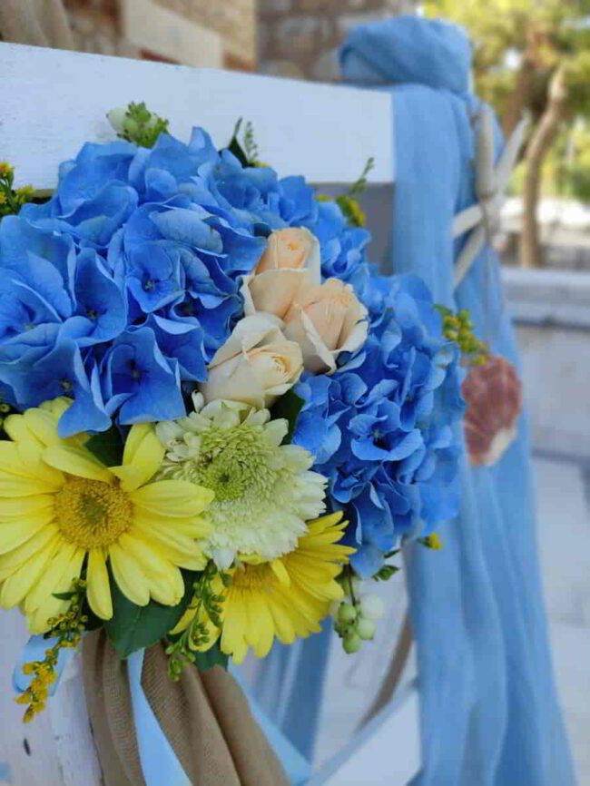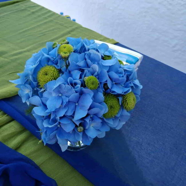 Στον Προφήτη Ηλία αναλάβαμε μια πιο λιτή βάφτιση σε δροσερούς τόνους. Με κυριάρχα χρώματα το μπλέ και το πράσινο στολίσαμε τον εσωτερικό διάκοσμο με μπουκέτα με ορτανσία και χρυσάνθεμο feeling green, ενώ στην πόρτα του ναού τοποθετήσαμε πλεκτά στεφάνια με συνθέσεις στις ίδιες αποχρώσεις και κορδέλες.