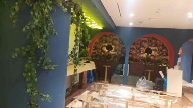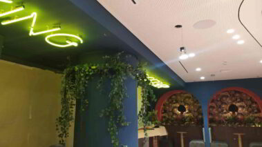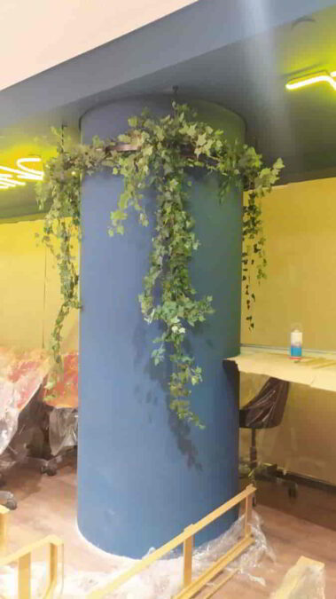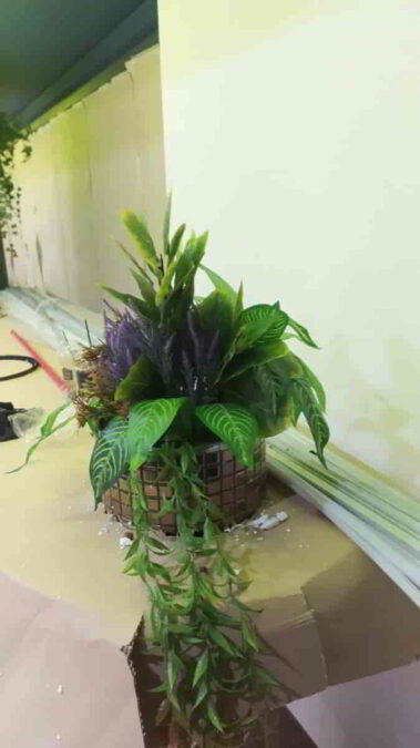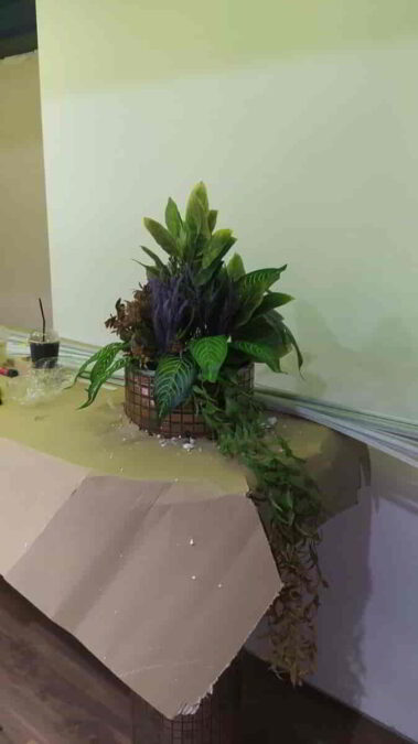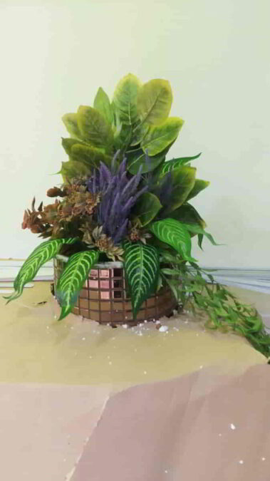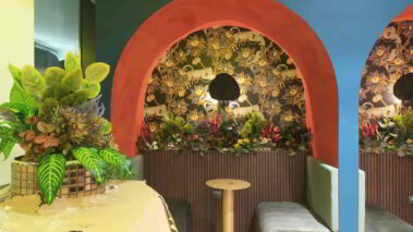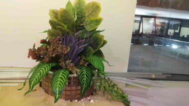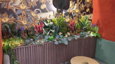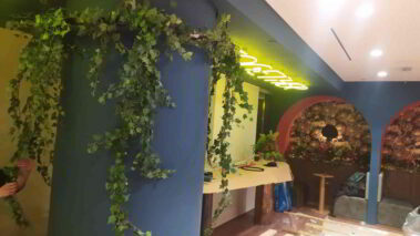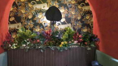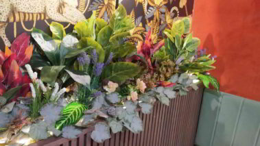 Αυτό προσπαθήσαμε να αποτυπώσουμε με συνθέσεις με μεταξωτά λουλούδια και πρασινάδες δημιουργώντας ένα τροπικό κλίμα, απόλυτα ταιριαστό με τα ξύλινα στοιχεία και τις ιδιότυπες ταπετσαρίες των χώρων. Μεταξωτοί κισσοί, banana leaves, λεβαντίνες και παχύφυτα είναι μερικά από τα είδη που επιλέξαμε για να δημιουργήσουν το μωσαϊκό της tropical αισθητικής και να εμπνεύσουν την πιο διασκεδαστική πλευρά της δικής μας και της ζωής.