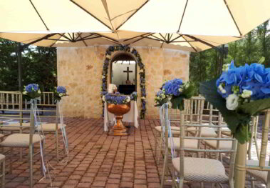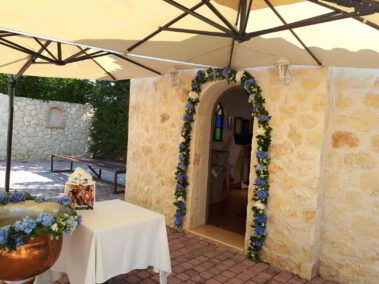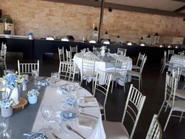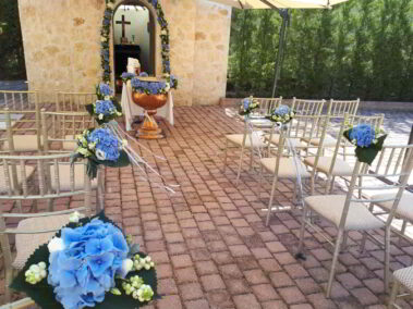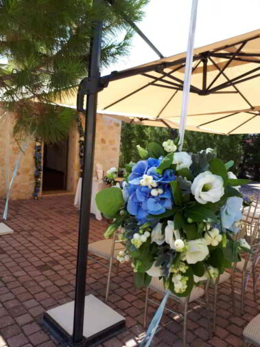 Τέλος, ο εξωτερικός χώρος διακοσμήθηκε σε διάφορα σημεία με αιωρούμενες συνθέσεις σε σχήμα μπάλας και στα τραπέζια της δεξίωσης τοποθετήθηκαν ανισσόπεδα βαζάκια με μικρά μπουκέτα. Βασικά χρώματα ολόκληρου του στολισμού ήταν το μπλέ, το πράσινο και το λευκό, επιλογές που έδεσαν και ανέδειξαν τα γήινα χρώματα του χώρου.