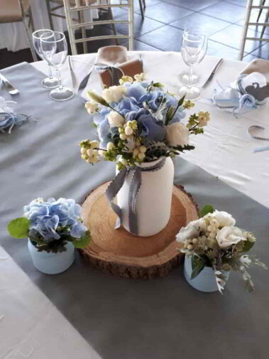 Στον μαγευτικό χώρο του κτήματος Chevallier στην Βαρυμπόμπη αναλάβαμε μια βάφτιση με λιτές γραμμές και κυριάρχα στοιχεία την ορτανσία, τον λυσίανθο και το μαργαριτάρι. Η κάμαρα του ναού στολίστηκε με μια μεγάλη γιρλάντα, όπως και η κολυμπήθρα, ενώ ανάμεσα στις θέσεις των καλεσμένων σχεδιάστηκε ένας διάδρομος με ενυπωσιακά μπουκέτα και κορδέλες.