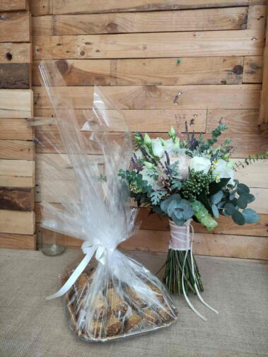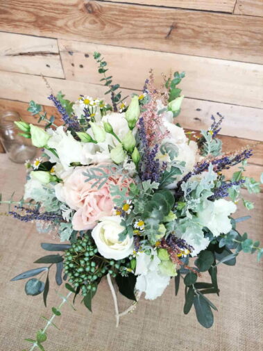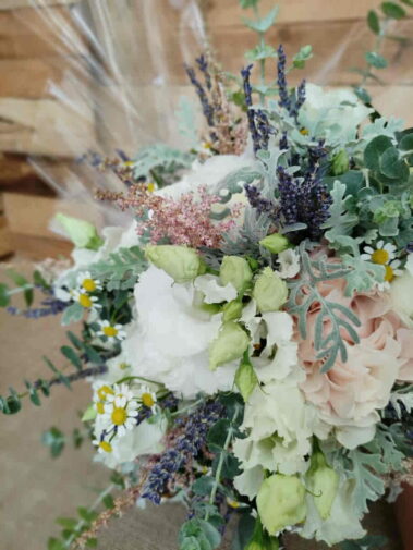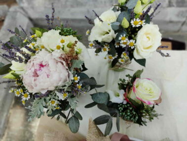 Στην ίδια λογική και αισθητική, η νυφική ανθοδέσμη περιελάμβανε παιώνια, λυσιάνθο, τριαντάφυλλο, ματρικάρια, λεβάντα, dusty miller, ευκάλυπτο και καρπούς, ενώ το δέσιμο αποτελούνταν απο κορδέλες Gros και πέρλες σε περίτεχνο συνδυασμό.