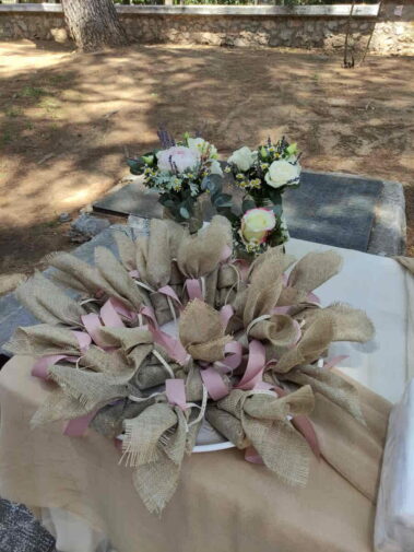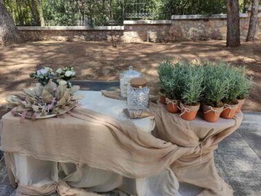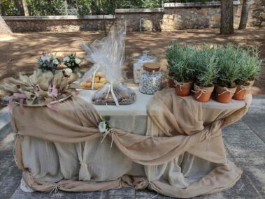 Με μια κατεύθυνση σε πιο γήινους τόνους και αποχρώσεις, στήσαμε επίσης ένα τραπέζι για κεράσματα και μπομπονιέρες, που συνοδευτικά οι καλεσμένοι λάμβαναν μια πήλινη γλαστρούλα με λεβάντα.