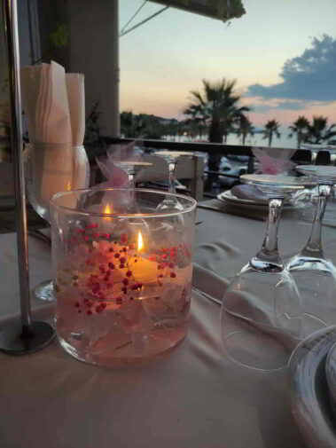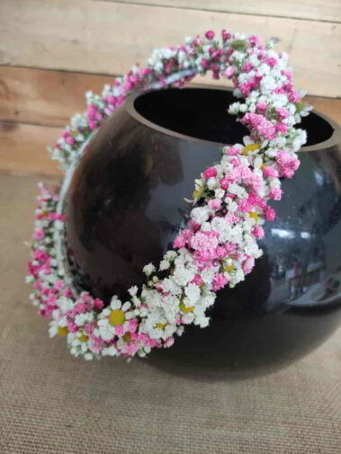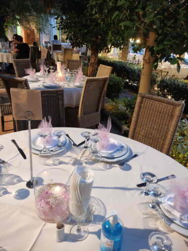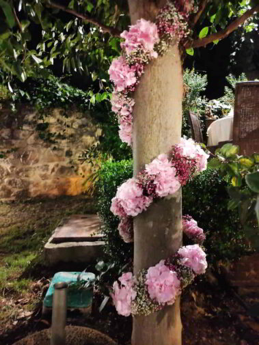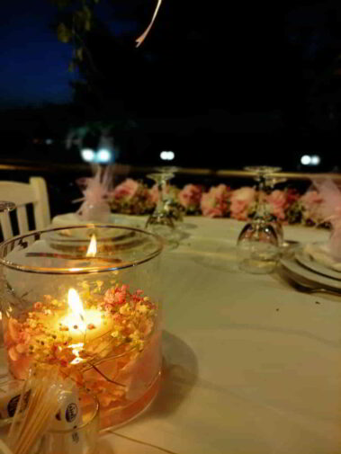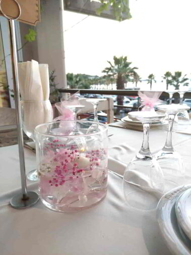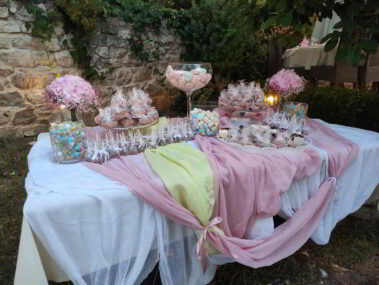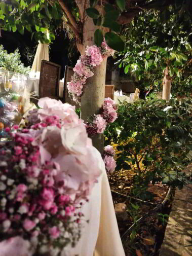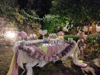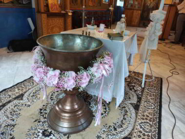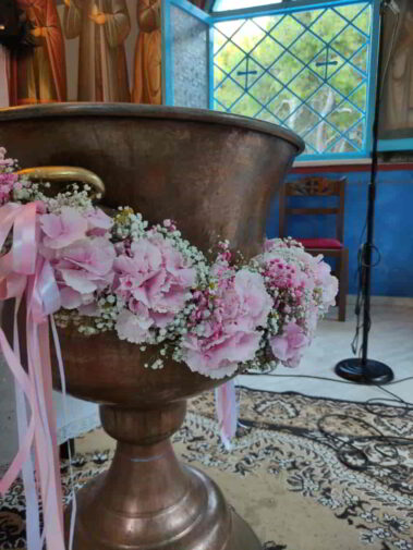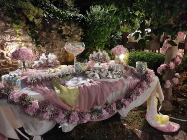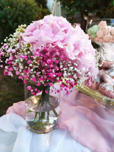 Σε μια ονειρική τοποθεσία στα περίχωρα της Αττικής δημιουργήσαμε μια παραμυθένια βάφτιση για μια μικρή νεράιδα σε τόνους λευκού και ροζ. Μεγάλες γιρλάντες με ορτανσία και γυψόφυλλο και πινελιές ματρικάριας στόλισαν το όμορφο παρεκκλήσι και την κολυμπήθρα. Στην ίδια φιλοσοφία διακοσμήθηκε και το κέντρο της δεξίωσης, όπου ετοιμάσαμε το βιβλίο των ευχών και τοποθετήσαμε σε κάθε τραπέζι ένα γυάλινο βάζο με πινελιές ορτανσίας, ματρικάριας και γυψόφυλου και ένα επιπλέον κερί. Το αποτέλεσμα ήταν μια γιορτή σαν σε “όνειρο καλοκαιρινής νύχτας.”